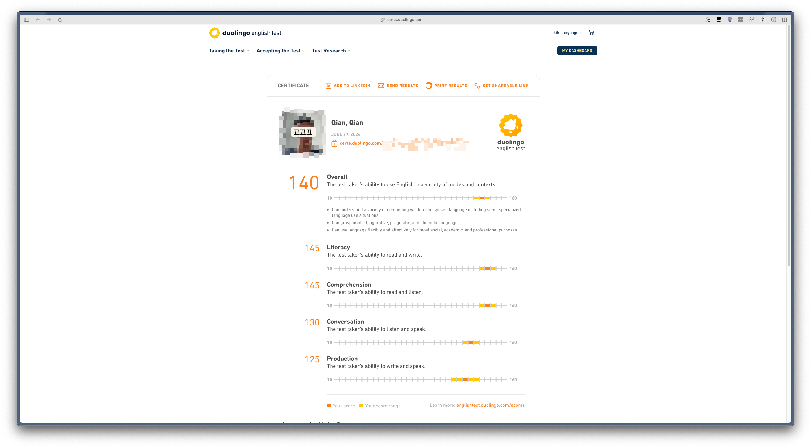 我的 Duolingo English Test 成绩认证证书
